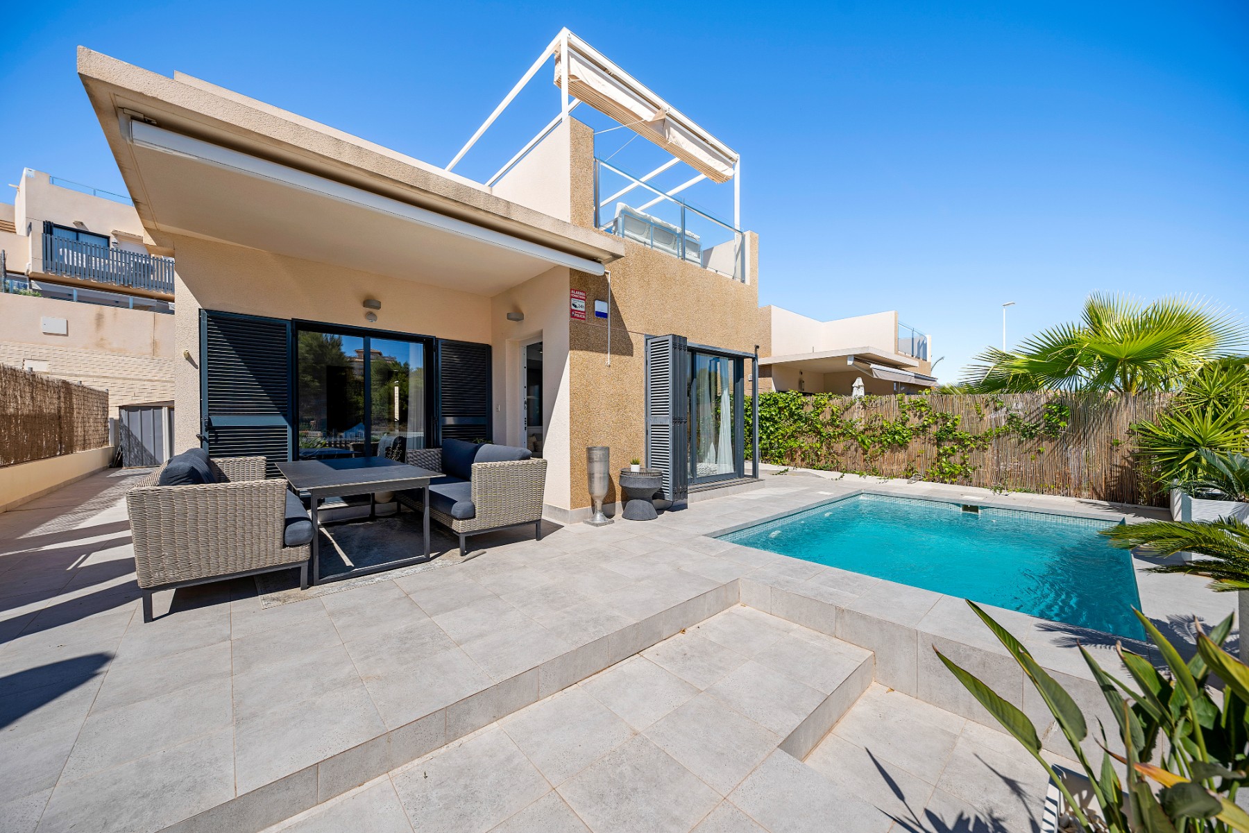Discover this stunning villa in the heart of La Zenia, boasting modern design and luxurious amenities. This property features three spacious bedrooms and two contemporary bathrooms, ideal for comfortable family living or a tranquil retreat. The villa’s layout is thoughtfully designed to maximize space and natural light, creating a bright and inviting atmosphere throughout.