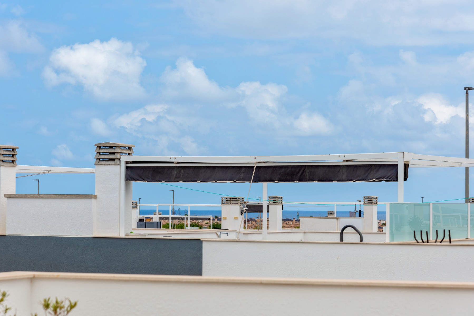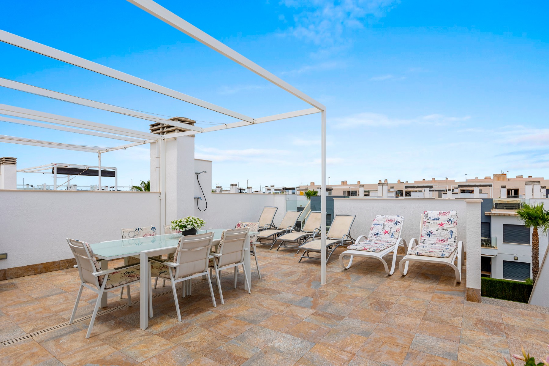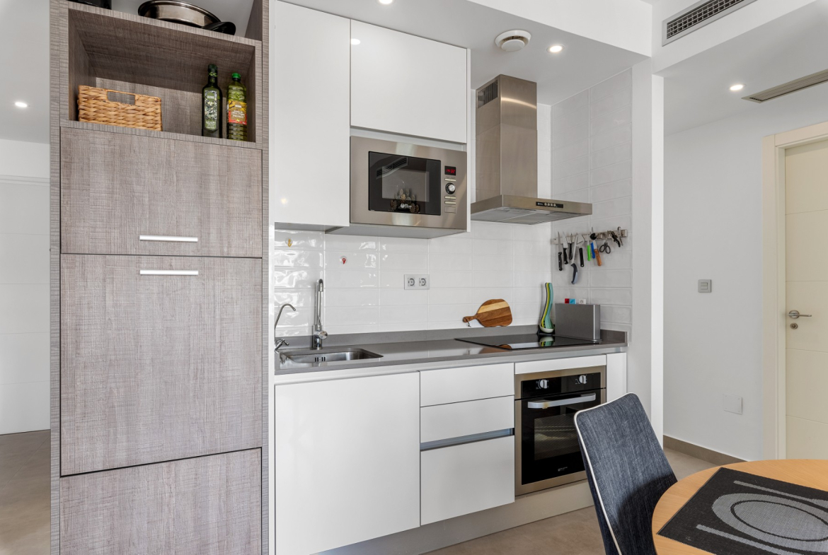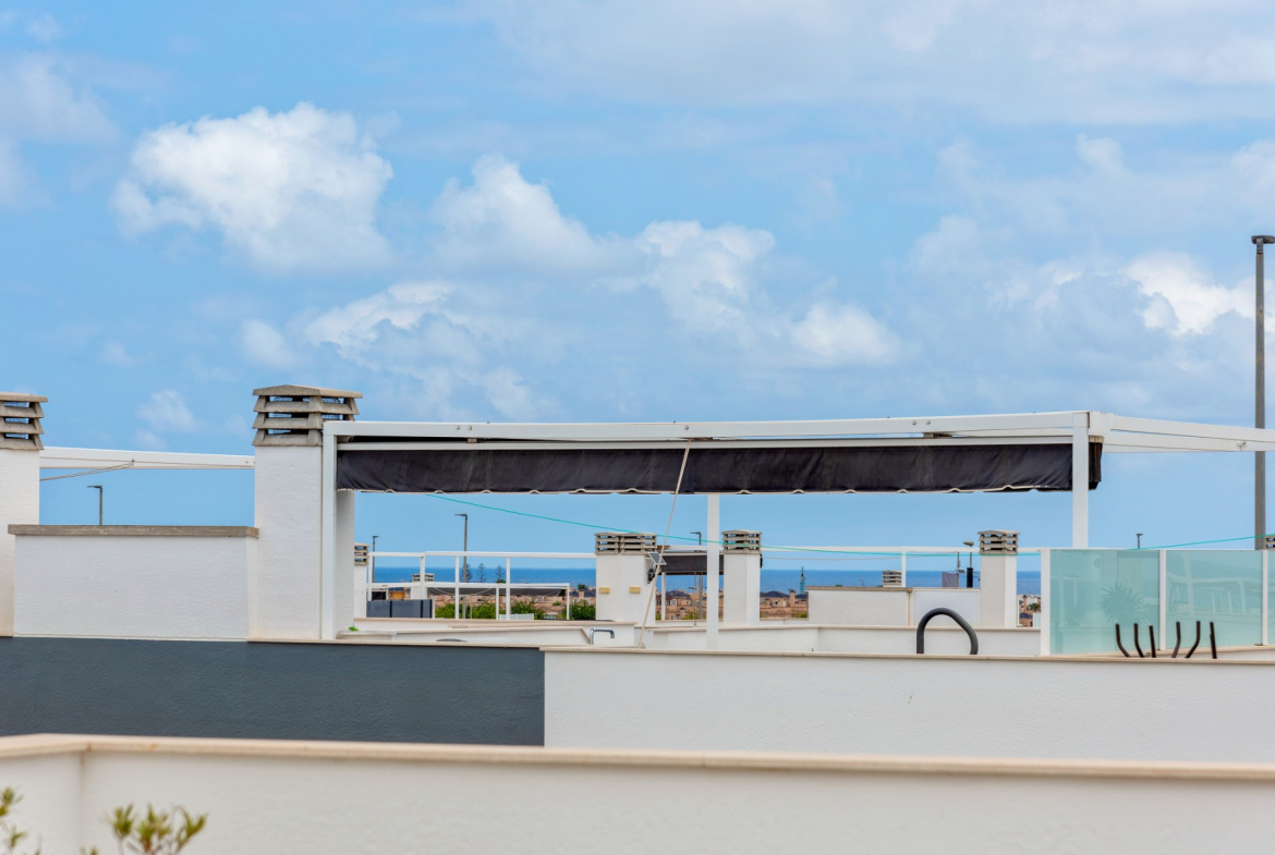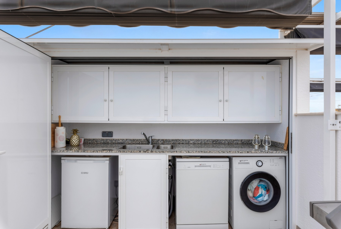 The apartment for sale is one of the very best in the complex, with 3 bedrooms, 2 delicate bathrooms, bright and cozy living room with open plan kitchen, terrace facing the shared pool, in addition to a wonderful private roof terrace. The roof terrace is exceptionally well utilized with storage space, a great outdoor kitchen and a pergola – this functions as an extra living room where you can enjoy the sun all day long. The outdoor kitchen is equipped with stone worktops, plenty of cupboard space, a dishwasher and a small fridge. Washing machine and water heater are also located in a cupboard on the roof terrace.