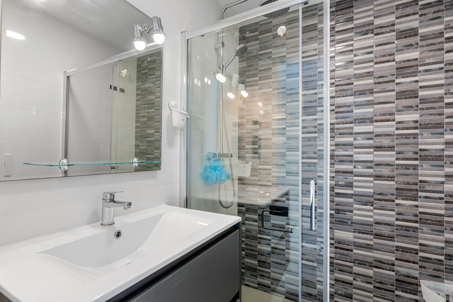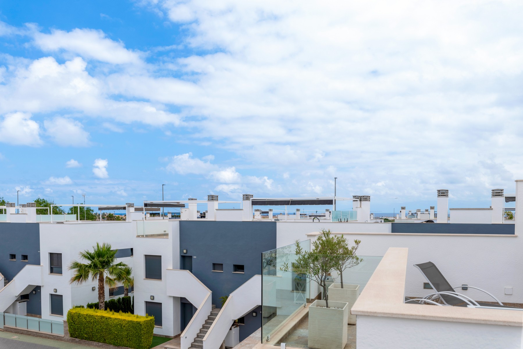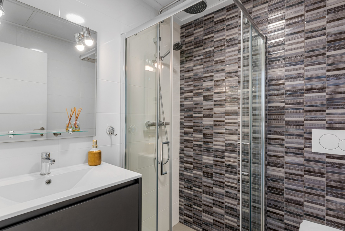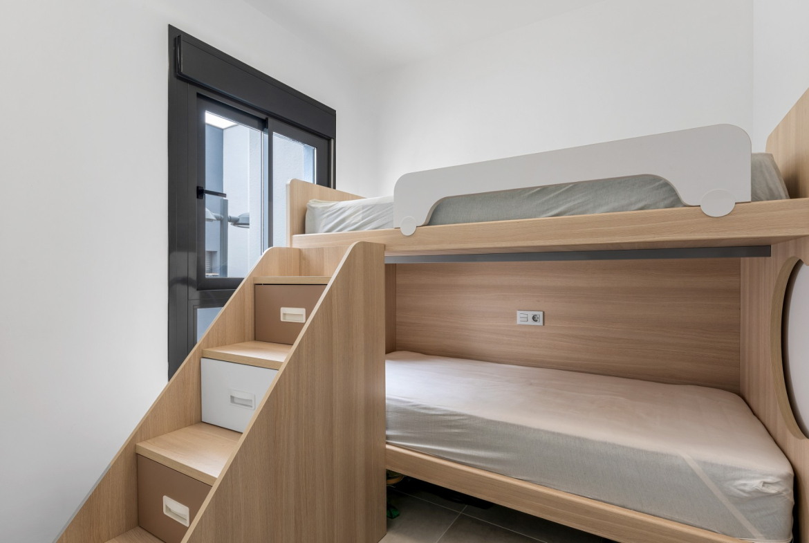 The apartment for sale is one of the very best in the complex, with 3 bedrooms, 2 delicate bathrooms, bright and cozy living room with open plan kitchen, terrace facing the shared pool, in addition to a wonderful private roof terrace. The roof terrace is exceptionally well utilized with storage space, a great outdoor kitchen and a pergola – this functions as an extra living room where you can enjoy the sun all day long. The outdoor kitchen is equipped with stone worktops, plenty of cupboard space, a dishwasher and a small fridge. Washing machine and water heater are also located in a cupboard on the roof terrace.