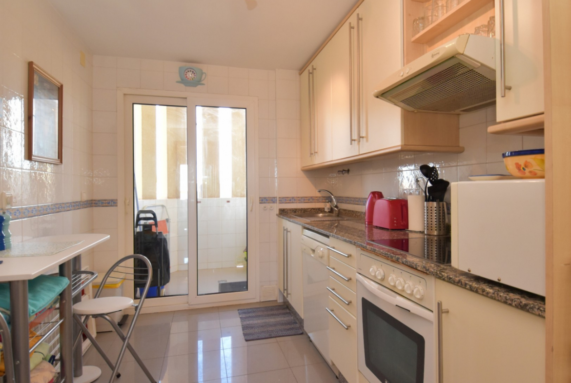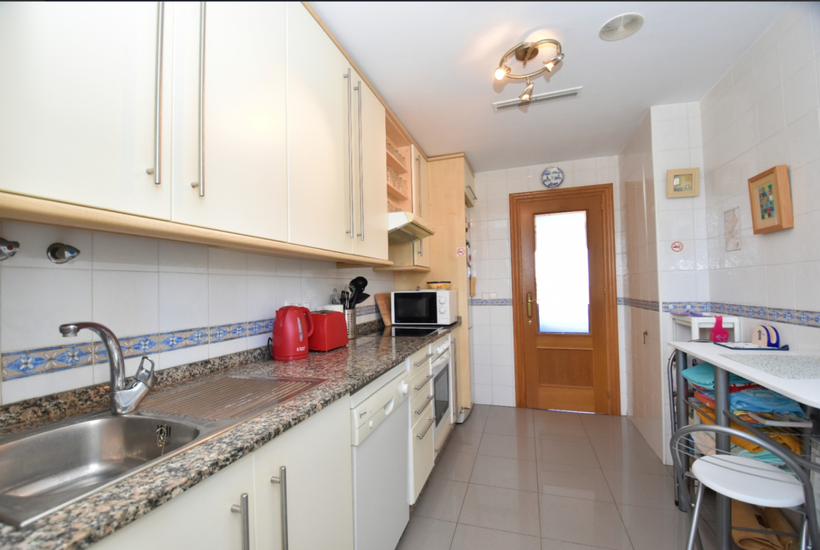 The apartment features a generously sized independent kitchen, fully equipped with high-quality appliances and an adjoining laundry room for added convenience. The master bedroom, has its own double doors leading to the large terrace, with spectaular sea views.