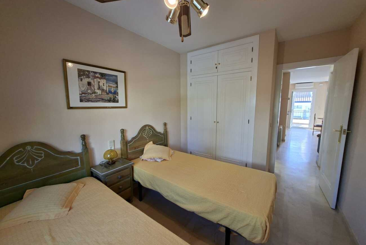 Beautiful semi-detached bungalow located in Orihuela Costa, Villamartín, in the Los Dolses area, Residencial Rioja V. A well-established area, just a 10-minute drive from the beaches of La Zenia or Cabo Roig. Surrounded by three prestigious golf courses (Villamartín, Las Ramblas, Campoamor). The area is notable for its proximity to the La Rioja Shopping Center (which includes a Dialprix supermarket and restaurants), the Villamartín Plaza Shopping Center, and the Zenia Boulevard Shopping Center. Excellent connection to the N332 road and the AP-7 motorway, facilitating access to Alicante (45 min) and Murcia airports. • Description: Semi-detached bungalow on two floors with private front and rear gardens and a solarium on the upper floor. Renovated and fully furnished. Ready to move in. It features a living-dining room with a fireplace, a kitchen with a breakfast bar and brand-new cabinetry (upper and lower cabinets, granite countertop, stainless steel extractor hood, ceramic hob, oven, and electric water heater), a full bathroom, and two large bedrooms, both with built-in wardrobes. The upper floor, accessed by an external staircase, has a 36.67 m² solarium, part of which is covered, with lighting and a water connection. It has split-system air conditioning in the living room, ceiling fans in the bedrooms, and central heating with radiators and hot water from a gas boiler. Gas supply is not currently connected. The complex features well-maintained communal gardens and two swimming pool areas, one of which is located directly in front of the rear of our bungalow. • Area: 63.50 m² built plus 10.81 m² of landscaped plot at the front and rear, plus a 36.67 m² solarium.