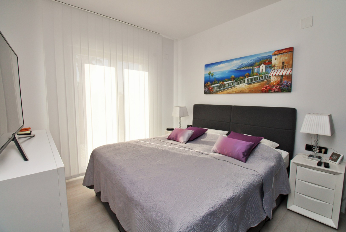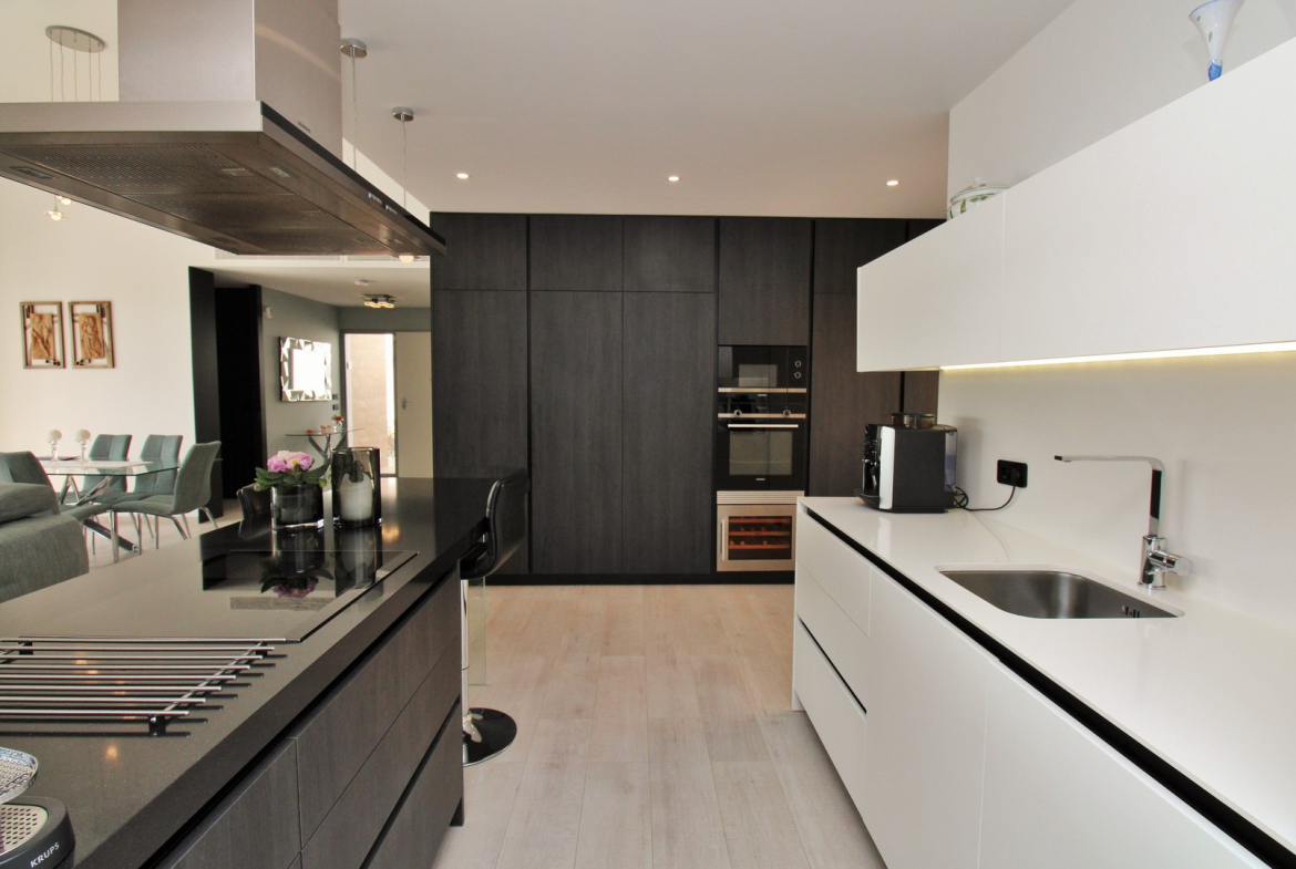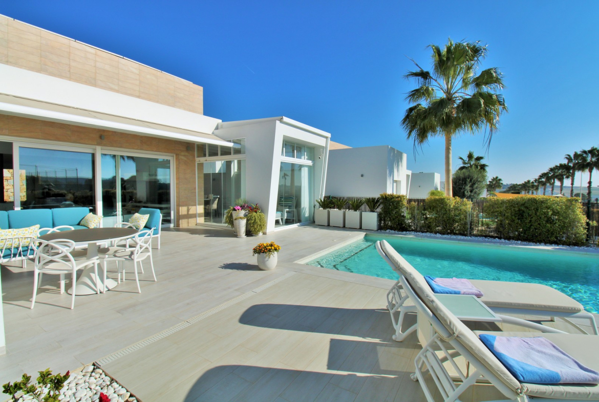 The spacious, light-filled living area features high ceilings and expansive windows, creating an inviting and open atmosphere. The fully equipped kitchen with built-in appliances flows seamlessly into the lounge and dining space, while an enclosed conservatory extends the living area—ideal for use as a summer kitchen or secondary dining space with direct access to the private pool and sun-soaked garden. The villa offers three well-proportioned double bedrooms with fitted wardrobes. The master suite boasts its own en-suite bathroom and a walk-in wardrobe, while the stylish family bathroom includes a walk-in shower. Designed for year-round comfort, the property includes solar panels, electric blinds, a retractable sun awning, an electric gate for the carport, and a pool heating system.
