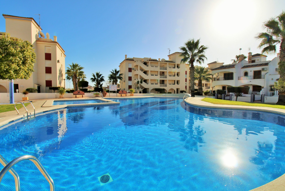 This spacious ground floor corner apartment is located in the sought-after Jumilla III complex in Playa Flamenca, Orihuela Costa, ideally positioned close to the popular La Florida area and between Punta Prima and Playa Flamenca beaches.