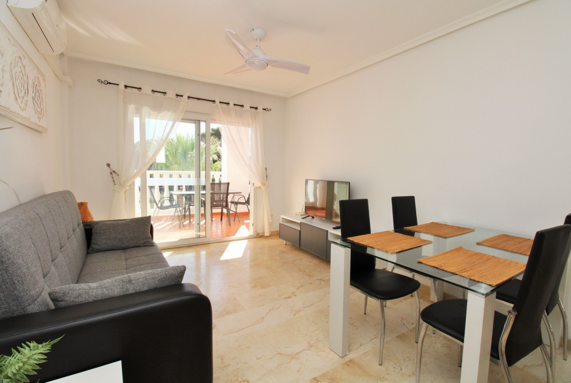 Inside, the apartment features a bright and airy lounge-dining area with a fitted kitchen to the rear, leading out to a sunny covered balcony overlooking the pool and golf course. There are 2 double bedrooms with fitted wardrobes, including a main bedroom with direct access to the front balcony, plus a well-appointed family bathroom.